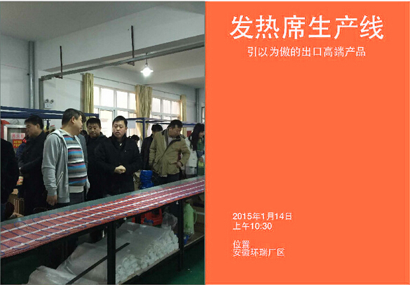 2015年1月14日新年伊始,環(huán)瑞迎來了新疆烏蘇市相關(guān)領(lǐng)導蒞臨考察,烏蘇市相關(guān)領(lǐng)導在環(huán)瑞董事長計成志陪同下參觀了環(huán)瑞電伴熱帶、發(fā)熱地席和環(huán)瑞現(xiàn)代化展廳,并在環(huán)瑞會議時聽取環(huán)瑞員工對環(huán)瑞未來發(fā)展的相關(guān)介紹。