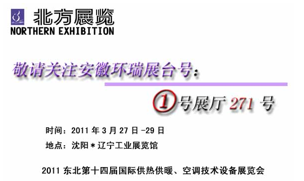 2011年3月27日-29日,安徽環瑞參加東北國際供熱空調設備展覽會。屆時,我們公司將展出公司的新型技術產品。希望廣大新老客戶來我展臺參觀洽詢,我們的展會人員將以飽滿的情緒接待來至世界各地的每一位關注我們安徽環瑞的貴客。